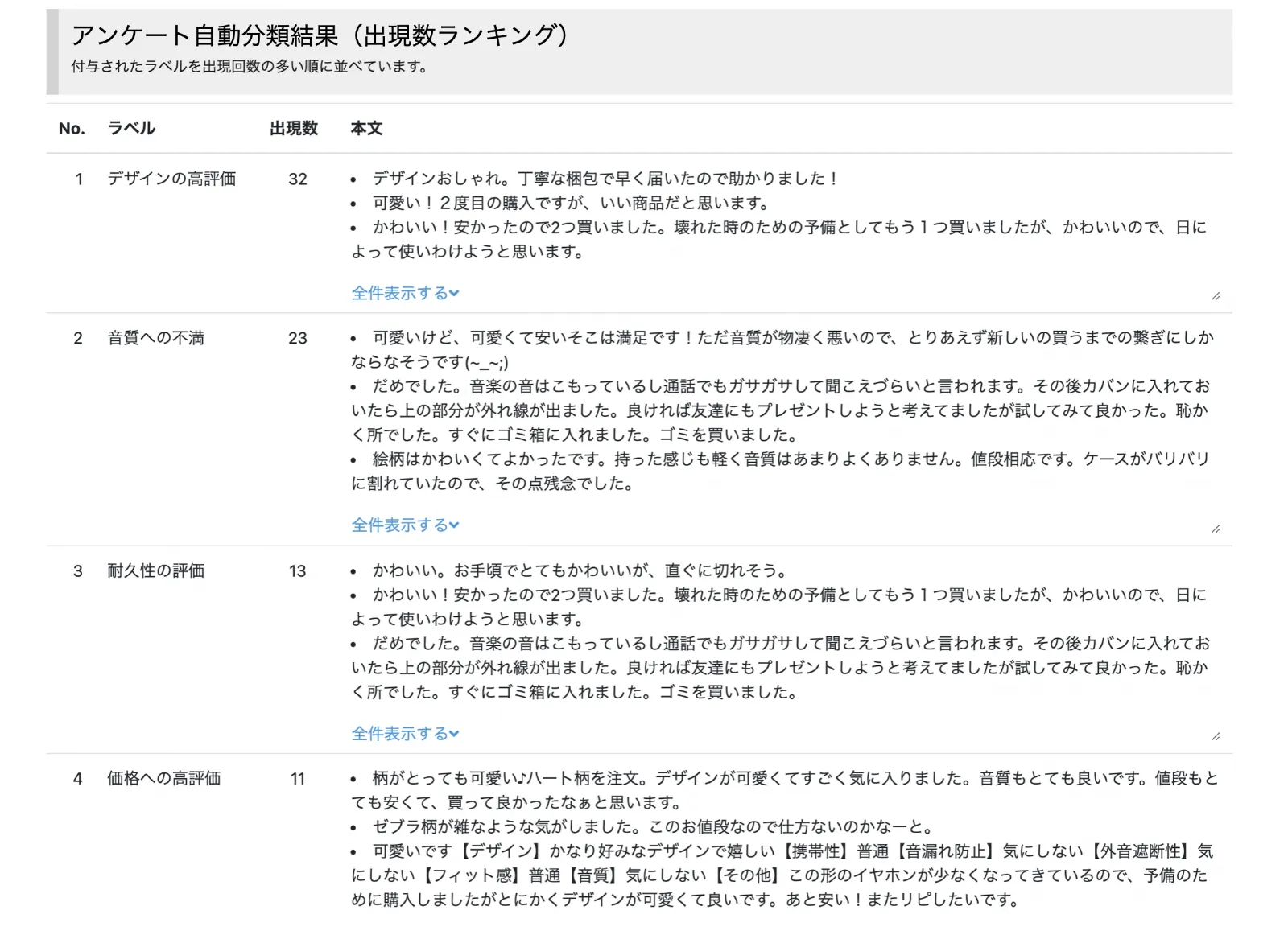 アンケートの自由記述等の定性的なデータを定量的なコードに自動で分類します。人手による煩雑な作業から解放され、迅速かつ正確なデータ分析が可能になります。